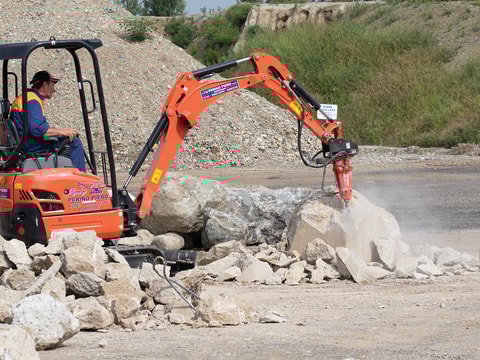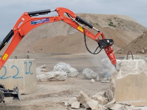 Rammer E01 is the smallest compact model hydraulic hammer, suited for carriers in the 0.4 to 2.8 ton range.
